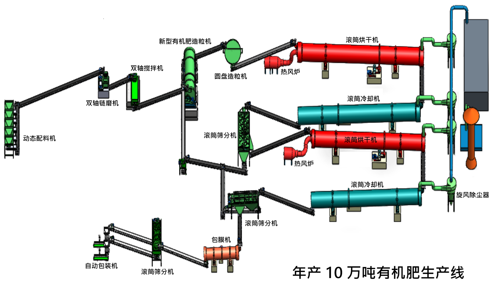 有機(jī)肥成套設(shè)備一般包含 : 發(fā)酵設(shè)備、攪拌設(shè)備、粉碎設(shè)備、造粒設(shè)備、烘干設(shè)備、冷卻設(shè)備、肥料篩分設(shè)備、包裝設(shè)備等。